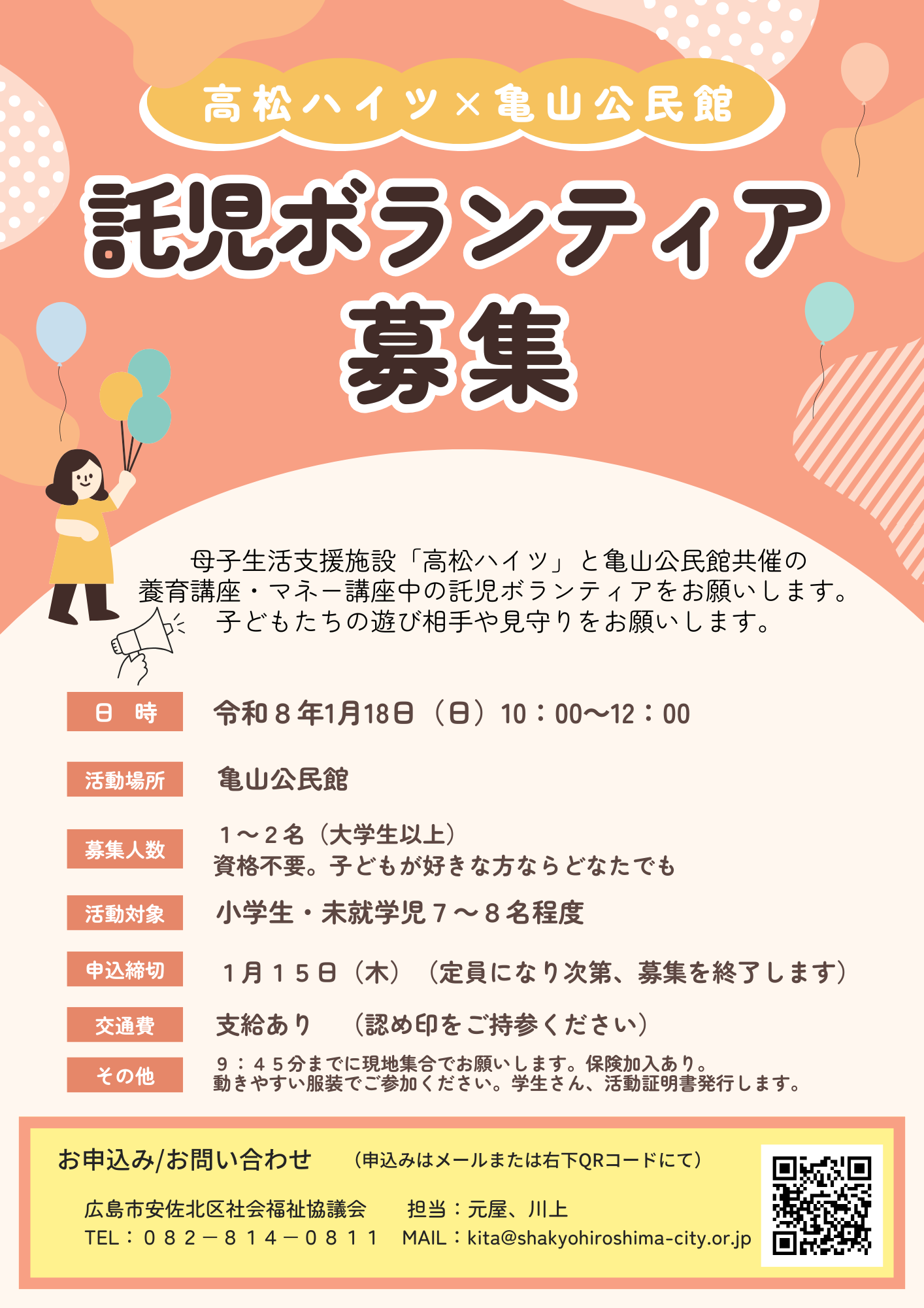 母子生活支援施設高松ハイツと亀山公民館共催の養育講座中の託児ボランティアを募集します!!
