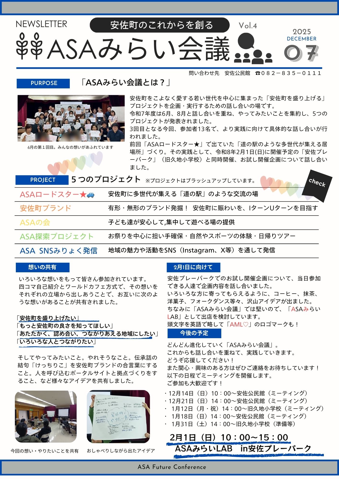いろいろな方に寄ってもらえるように、コーヒー、抹茶、洋菓子、フォークダンス等々、沢山アイデアが出ました。ちなみに「ASAみらい会議」では堅いので、「ASAみらいLAB」として出店を検討しています。