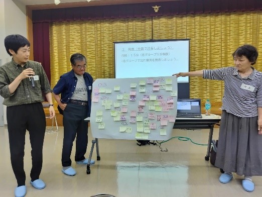 交通や買い物の不便さや若い人がいない、草刈りが大変、行事の継続が難しくなってきているといった課題が出た一方、町内会ごとのイベント(神楽、田楽等の祭り、敬老会やとんど等の行事など)を合同でやってはどうかとか、水内川を活用したイベントがあればいいな、といった水内地区の強みを存分に活かしたアイデアも出ました。