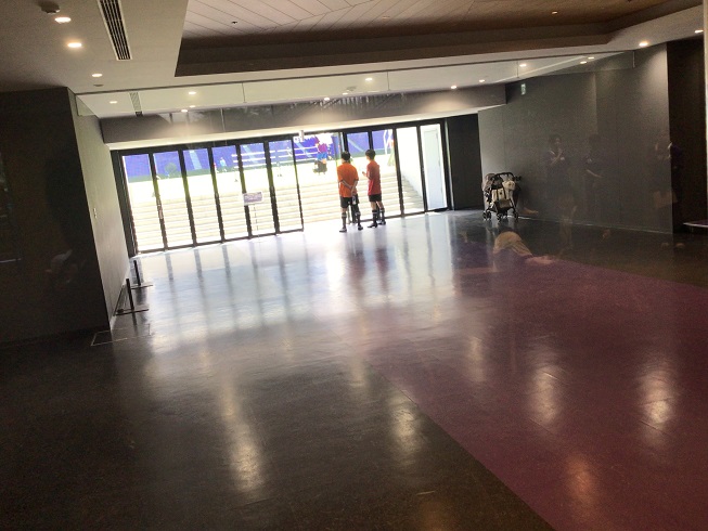 ピッチ上では実際に試合をしているグループがあり、記念撮影をしていた子どものところへボールが飛んできたので、選手にそのボールをパスで返す場面がありました。