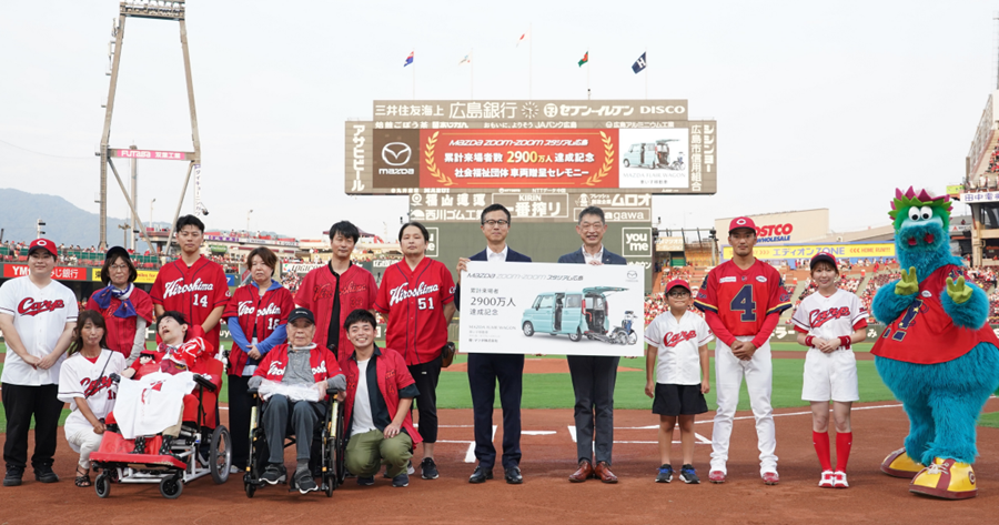 この事業は、マツダ株式会社が広島市民球場の命名権取得の際に、社会貢献活動の一つとして来場者数が100万人を達成するごとに、社会福祉法人へマツダ車を1台贈呈することを広島市に提案したことから始まっております。広島市社会福祉協議会は、MAZDA Zoom-Zoom スタジアム 広島の来場者が100万人達成されるごとに、マツダ株式会社からお声がけいただき、福祉施設の推薦をしています。これからも、ひとりでも多くの方にご来場いただき応援してくださることを願っています。