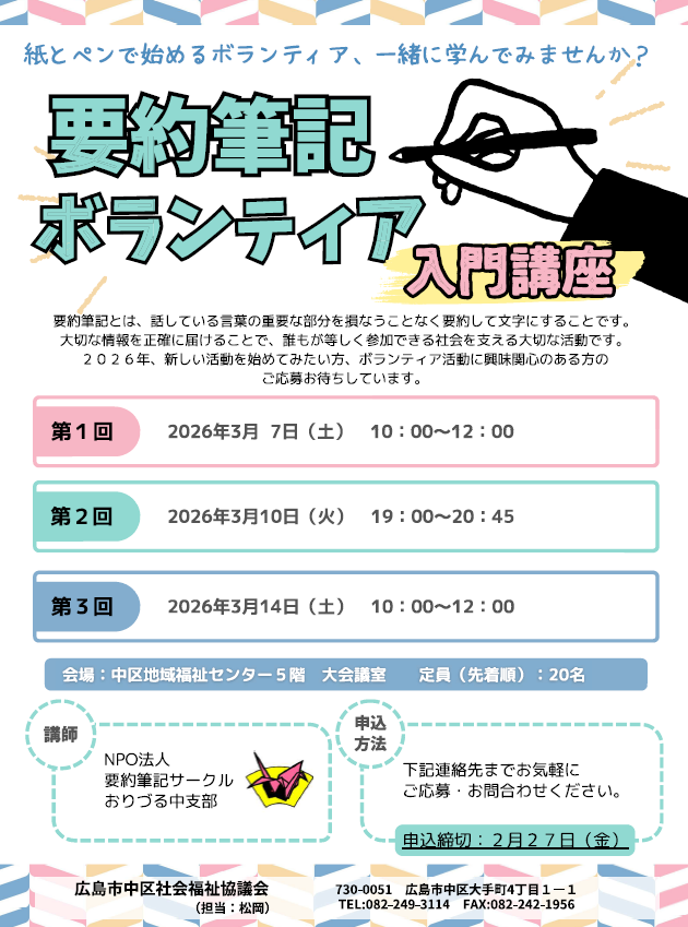 〈入門講座〉中区 要約筆記ボランティア入門講座 受講生募集! (2026-02-12)