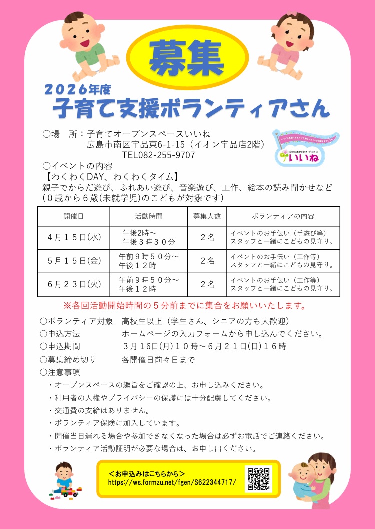 「子育てオープンスペースいいね」での子育て支援ボランティアを募集します (2026-03-16)